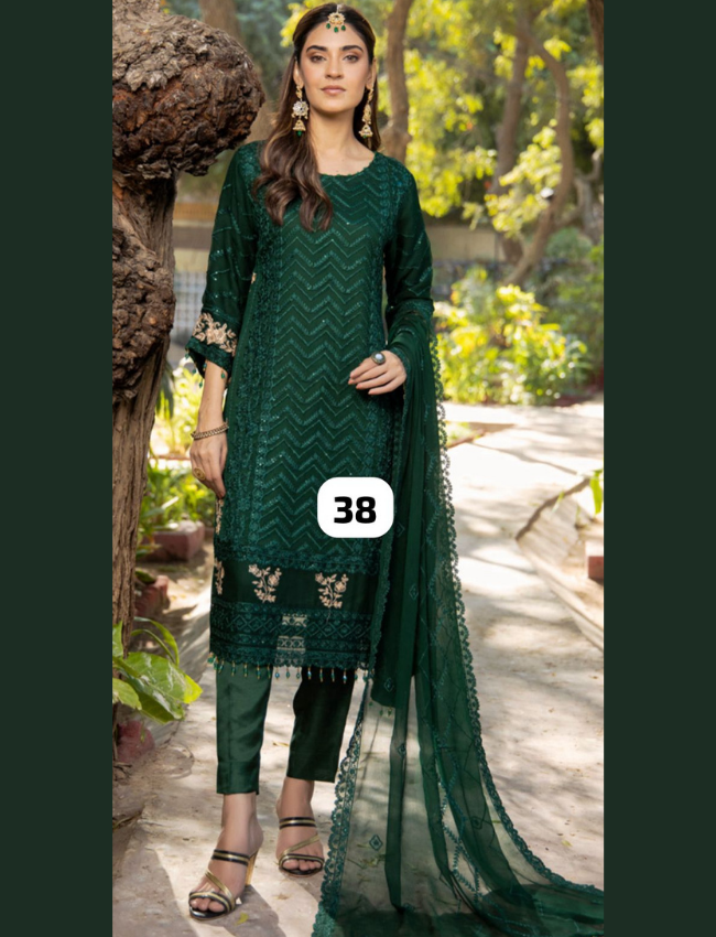Luxury Chiffon Embroidered Shirt (with inner stitched) & Dupatta with Raw Silk Trouser.